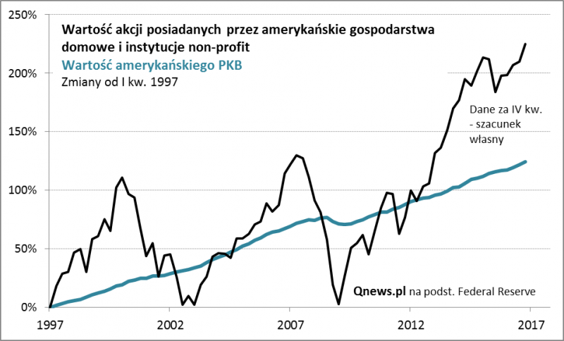 Ostatnia mocna fala wzrostowa na Wall Street to oczywiście powód do zadowolenia dla tych inwestorów, którzy te akcje już wcześniej mieli w portfelu, ale czy również dla tych, którzy chcą je kupić? Aby odpowiedzieć na to pytanie powróćmy do analizy z początku października, w której dokładnie omówiliśmy wskaźnik, który historycznie pozwalał dość nieźle prognozować przyszłe długoterminowe stopy zwrotu. Z raportów Fedu wyłowiliśmy wartość akcji posiadanych przez gospodarstwa domowe w USA i porównaliśmy ją z wartościami PKB na przestrzeni przeszło 60. lat (nikt nie może więc zarzucić, że wskaźnik ma zbyt krótką historię). Czas odświeżyć te rozważania, bo po pierwsze Fed opublikował właśnie najnowsze dane za III kwartał, a po drugie można szacować, że ostatni wystrzał S&P500 mocno przesunął omawiany wskaźnik.