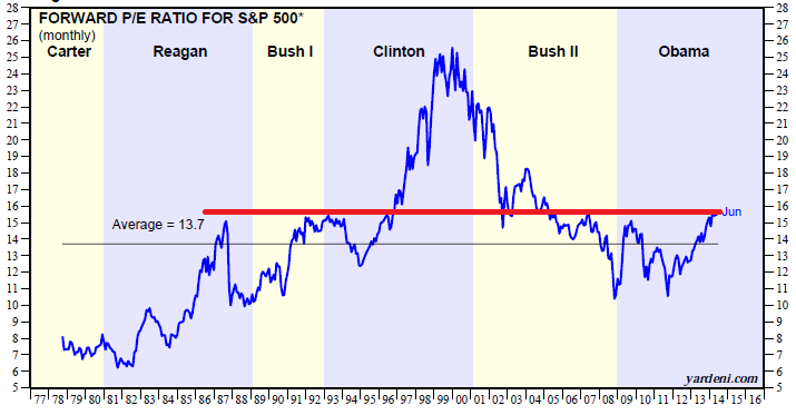 Jak pisaliśmy przed tygodniem, przykładowo wskaźnik ceny do prognozowanych zysków spółek z S&P 500 jest ok. 12 proc. powyżej wieloletniej średniej, co zdaje się potwierdzać słowa Yellen. Z drugiej strony warto jednak pamiętać, że na przestrzeni niemal czterdziestu lat wskaźnik ten zawędrował wyżej niż obecnie tylko jeden raz: w latach 1997-1999, czyli właśnie w okresie pompowania jednej z największych baniek spekulacyjnych w dziejach Wall Street. Innymi słowy, historyczne średnie wspomniane przez Yellen są de facto zawyżone przez tę właśnie bańkę.