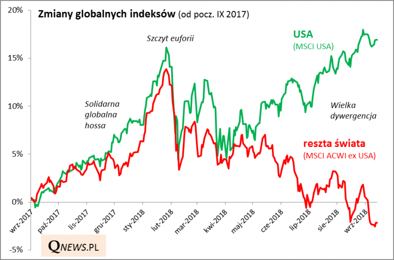Jeśli porównać tegoroczną bessę na warszawskiej giełdzie z niebotycznymi poziomami amerykańskich indeksów, można odnieść wrażenie, że sytuacja na GPW jest zupełnie oderwana od globalnych trendów. Okazuje się jednak, że nie jesteśmy jedyni. Co więcej, to amerykański rynek akcji wydaje się ... odosobniony w biciu rekordów. Tymczasem reszta finansowego świata radzi sobie nie najlepiej. Indeks gromadzący wszystkie rynki (rozwinięte i wschodzące) z wyjątkiem USA od szczytu styczniowej euforii spadł już o 14%. Także w skali ostatnich 12. miesięcy jego zmiana jest ujemna. Mamy do czynienia z niesłychaną "dywergencją" między mocnym zachowaniem indeksów na Wall Street i resztą świata.