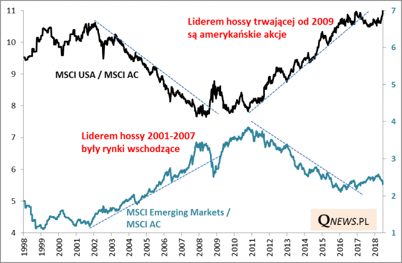 Trzeba jednak pamiętać o jednej ważnej kwestii. Nie zawsze tak było. W okresie poprzedniej hossy (2003-2007) było ... dokładnie na odwrót, tzn. amerykańskie akcje pozostawały w tyle, a emerging markets (a wraz z nimi polskie akcje) przeżywały okres świetności. Może kiedyś będzie powtórka (choć na razie nic na to nie wskazuje)?
