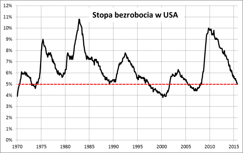Poziom 5% przez niektórych ekonomistów określany jest jako bliski "pełnemu zatrudnieniu". Faktycznie, jak pokazuje wykres na przestrzeni dekad ciężko było zejść ze stopą bezrobocia dużo niżej. Nic zatem dziwnego, że amerykański Fed przymierza się do pierwszej od lat podwyżki stóp procentowych. Część analityków oczekuje jej już w grudniu.