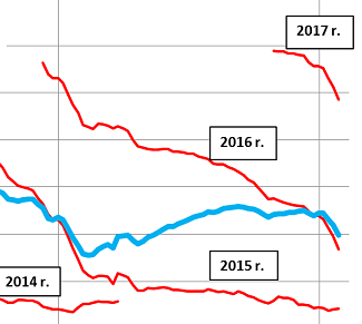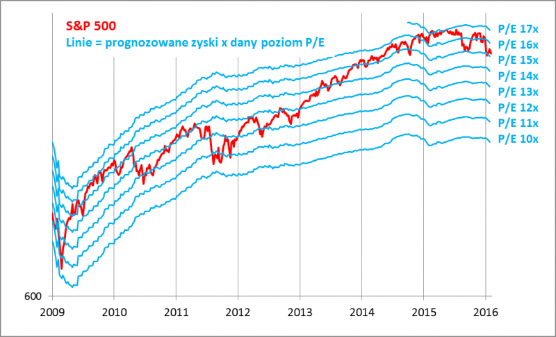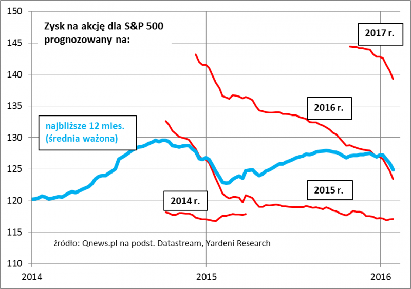 Charakterystyczne jest to, że zmaganiom S&P 500 towarzyszy szybka obniżka prognoz zysków spółek. Od początku roku analitycy obniżyli szacunki na 2016 r. średnio o 3%, a na 2017 r. - o ok. 2%. Co prawda sam fakt rewizji w dół nie jest niczym nowym (tak się dzieje niemal zawsze - analitycy wychodzą od bardzo optymistycznych oczekiwań, po czym je korygują), ale tempo tych rewizji jest wyjątkowo szybkie. To sprawia, że będący podstawą do wycen zysk prognozowany na najbliższe 12 miesięcy (średnia ważona z prognoz na 2016 i 2017 - niebieska linia na poniższym wykresie) też znalazł się w trendzie spadkowym, a to już nie jest sytuacja typowa.