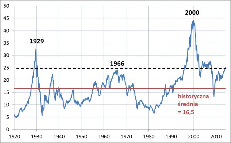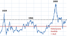 Dla uzupełnienia obrazu sytuacji warto przytoczyć też inną wersję P/E, zaproponowaną i na bieżąco obliczaną przez ubiegłorocznego noblistę, prof. Roberta Shillera. Pomysł, zainspirowany pracami Benjamina Grahama (słynnego mentora Warrena Buffetta), Shiller spopularyzował jeszcze w 2000 r., tuż przed pęknięciem bańki internetowej.