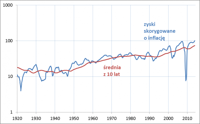Wskaźnik wycen w tej wersji, zwany CAPE (Cyclically-Adjusted P/E, czyli P/E skorygowany o cykl), bazuje na średnich zyskach spółek z ostatnich dziesięciu lat (po uwzględnieniu inflacji). Takie uśrednienie ma na celu odpowiedzieć na pytanie o to ile firmy są w stanie zarabiać w dłuższym okresie (wiadomo, że w czasie recesji zyski są przejściowo zaniżone, a w czasie boomu – zawyżone). Jak pokazuje wykres, realne (skorygowane o inflację) zyski spółek na przestrzeni dekad stopniowo rosną i ostatnio ustanawiają historyczne rekordy.