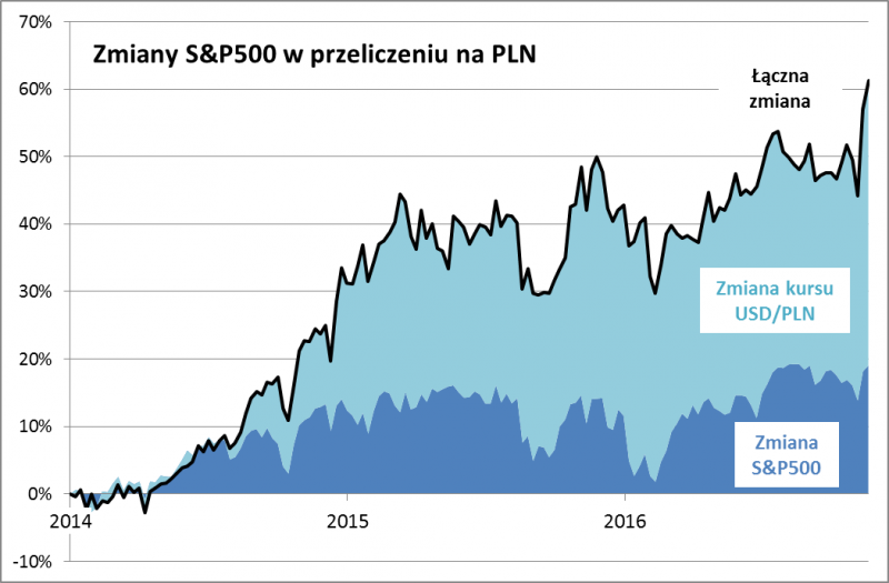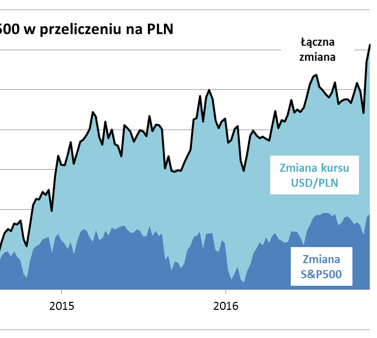 Taki rozwój wydarzeń ma rozmaite konsekwencje. W sferze polskich finansów publicznych można się spodziewać szybszego wzrostu długu, także w stosunku do PKB, choć oczywiście do krytycznej granicy 60% PKB na szczęście daleka droga (53,8% PKB na koniec II kw.). A z punktu widzenia czysto inwestycyjnego? Kolejny raz potwierdza się reguła, że szeroka dywersyfikacja popłaca. Posiadanie w portfelu aktywów denominowanych w walutach obcych popłaca w takich momentach, gdy PLN traci na wartości. Z naszych wyliczeń wynika, że amerykański indeks S&P500 w przeliczeniu na PLN znów bije rekordy. Ponieważ złoty osłabił się także względem euro, pomogło to również stopom zwrotu z aktywów z Eurolandu (np. z niemieckich akcji). Zauważmy jaką rolę w dywersyfikacji odgrywają aktywa zagraniczne - częściowo chronią realną wartość portfela przed deprecjacją naszej waluty.
