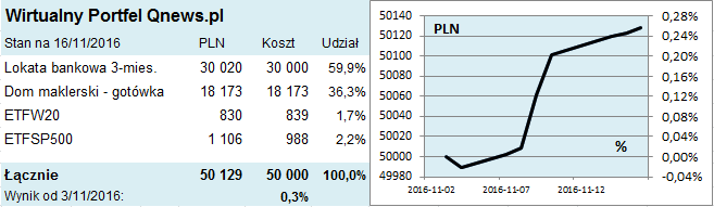 Nasz debiutujący niedawno Wirtualny Portfel skorzystał na ostatniej fali umocnienia USD względem PLN. Instrumenty ETFSP500 kupiliśmy w trakcie paniki tuż po wygranej Trumpa i od tego czasu ich wartość podskoczyła o 12%, po części za sprawą umocnienia USD (możemy tylko żałować, że nasza pozycja nie była większa, ale chcemy rozbudowywać portfel ostrożnie). Po panicznych nastrojach na Wall Street nie ma już śladu, wyceny akcji w USA powracają do szczytów, a dolar jest bardzo drogi, więc ... redukujemy ledwie co otwartą pozycję o połowę (składamy wirtualne zlecenie sprzedaży 1 sztuki ETFSP500 na otwarciu czwartkowej sesji). Dlaczego nie całą? Bo mimo wszystko widzimy nadal pewne pozytywy.