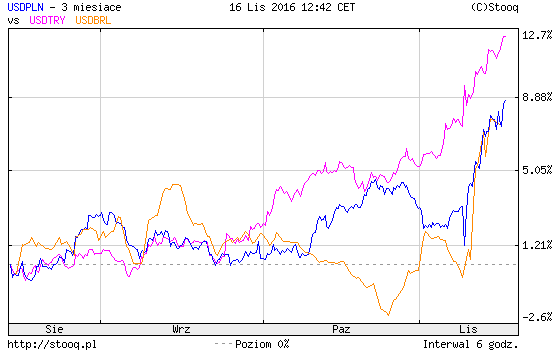 Właściwie jedyną reakcją rynków na wygraną D. Trumpa zgodną z wcześniejszymi założeniami analityków jest znaczne osłabienie walut rynków wschodzących. Przed falą uderzeniową nie ustrzegł się także polski złoty, często wrzucany do jednego koszyka z innymi emerging markets. Przy okazji "pomogły" w tym słabe dane nt. wzrostu PKB w III kwartale (tym tematem będziemy się jeszcze zajmować).