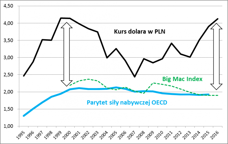 Te zalety nie powinny jednak prowadzić automatycznie do konkluzji, że to właśnie teraz jest dobry czas na kupowane aktywów denominowanych w USD. Jak pokazuje wykres upływa trzeci rok silnej aprecjacji dolara, która mocno wywindowała stopy zwrotu. Według naszych wyliczeń opartych na parytecie siły nabywczej, dolar jest też silnie przewartościowany względem złotego.