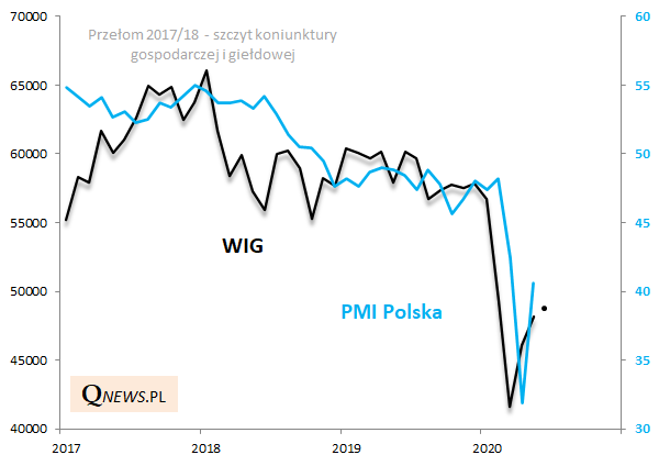 Czy tak będzie? Tego nie wiemy. Nie wiemy czy należy liczyć na dalsze "V-kształtne", dynamiczne odbicie w gospodarce, czy raczej - jak np. w latach 2001-02 - czeka nas raczej długotrwałe "udeptywanie" dna koniunktury (stagnacja). Wiadomo jednak, że PMI jest ciągle na bardzo niskim poziomie, nawet po majowym odbiciu. Podobnie jak WIG, który nawet po odbiciu jest ciągle ponad 25% poniżej szczytu sprzed ponad dwóch lat (koronawirusowy krach zwieńczył bessę trwającą od dwóch lat!).