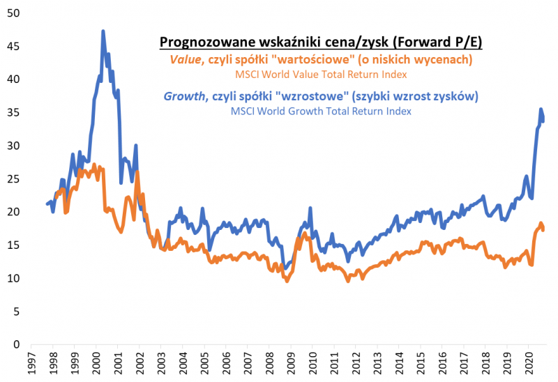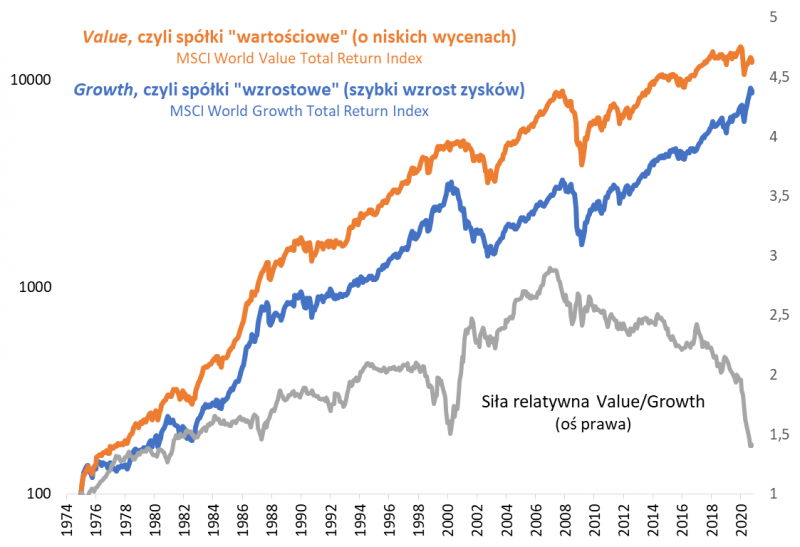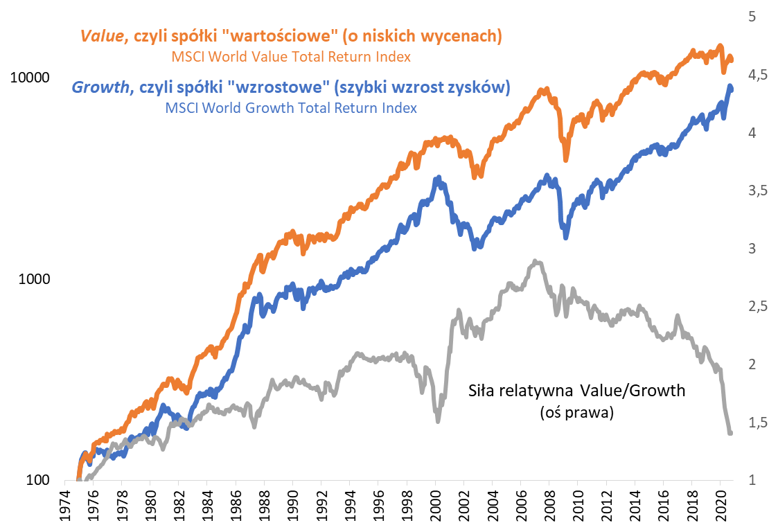 Od wielu lat dość powszechnie uznawanym dogmatem w świecie finansów było to, że inwestowanie w spółki określane jako „value” („wartościowe”, nisko wyceniane) na dłuższą metę przynosi lepsze stopy zwrotu niż inwestowanie w „growth”, czyli spółki „wzrostowe” (w domyśle – wysoko wyceniane). Za taką teorią przemawiał zresztą bogaty zbiór danych historycznych.