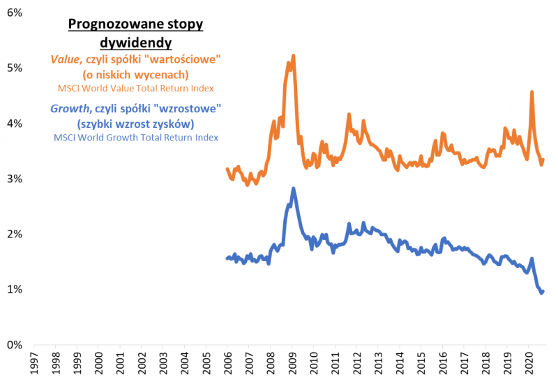 Rys. 3. Rekordowo niskie stopy dywidendy w spółkach „wzrostowych” i stabilne w spółkach „wartościowych”