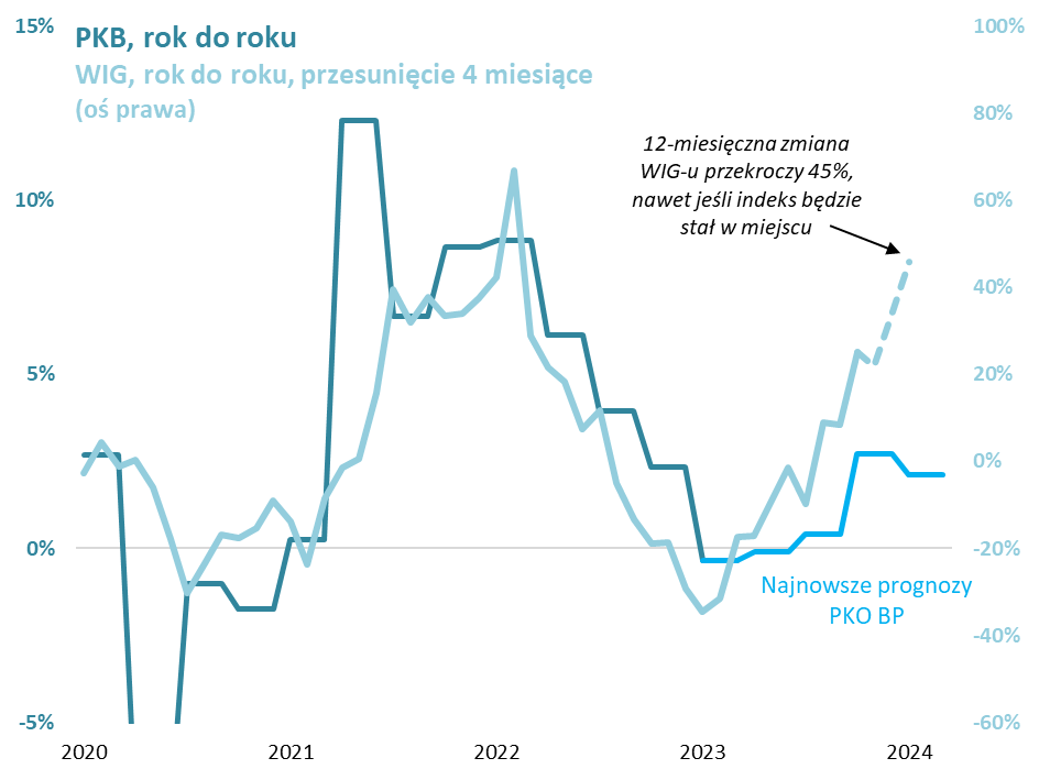 Rys. 2. Jeżeli nie dojdzie do większej korekty na rynku akcji, to efekt bazy popchnie 12-miesięczną zmianę WIG-u do poziomów charakterystycznych dla … szczytowego boomu w gospodarce