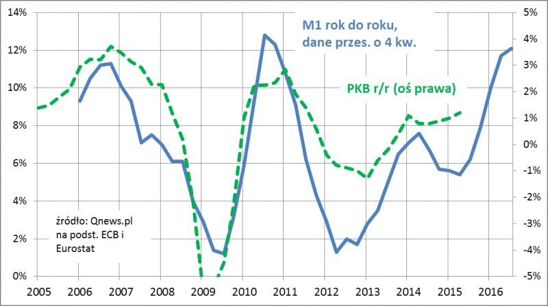Jeśli wierzyć historycznym prawidłowościom, jest to zapowiedź wejścia dynamiki PKB w strefie euro na coraz wyższe pułapy w kolejnych kwartałach (a to powinno pomagać akcjom). Ekonomiści tłumaczą to np. w ten sposób: wzrost podaży M1 to sygnał, że firmy i gospodarstwa domowe gromadzą zapasy gotówki na przewidywane większe wydatki (a te wydatki miałyby dźwignąć popyt w gospodarce). Zauważmy, że sytuacja jest diametralnie inna niż np. w roku 2008.