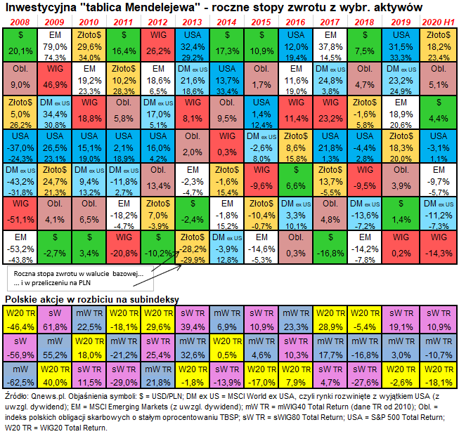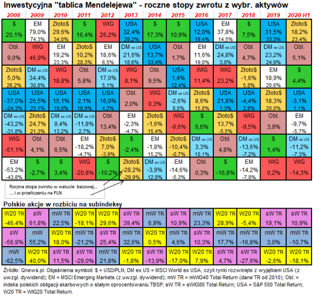 Zarówno koniec roku, jak i półrocza, to dla nas tradycyjnie okazja, by odświeżyć naszą „inwestycyjną tablicę Mendelejewa”, czyli barwnie zilustrowane zestawienie stóp zwrotu z wybranych aktywów, takich jak akcje z różnych rynków, polskie obligacje skarbowe, złoto, dolar amerykański. Cechą charakterystyczną owej tabeli jest uszeregowanie stóp zwrotu dla poszczególnych lat od najwyższych do najniższych (co oznacza, że dla każdego roku mamy osobny ranking). To swoista „piguła” zawierająca w kompaktowy sposób mnóstwo informacji na temat wyników inwestycyjnych.
