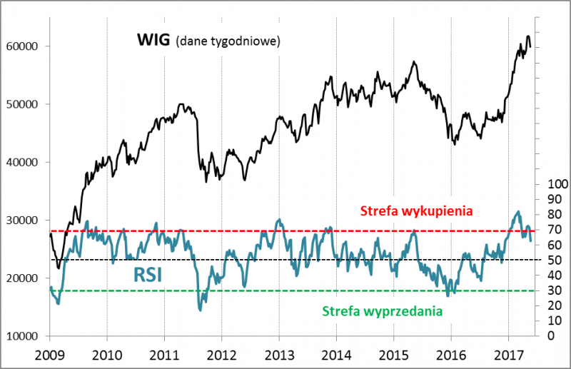 Tradycyjnie w takich sytuacjach spoglądamy też na popularny wskaźnik techniczny - oscylator RSI. Tyle że nie w domyślnej wersji dziennej, lecz bazującej na danych tygodniowych (na koniec każdego tygodnia).