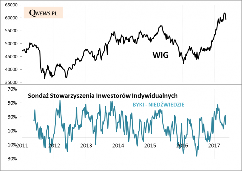 W jaki sposób przymierzyć się do ustalenia czegoś w rodzaju poziomów docelowych dla korekty? Można obserwować wskaźniki nastrojów. Według najnowszego sondażu Stowarzyszenia Inwestorów Indywidualnych optymizm już osłabł, ale dalszy spadek wskaźnika nastrojów byłby jednak możliwy.