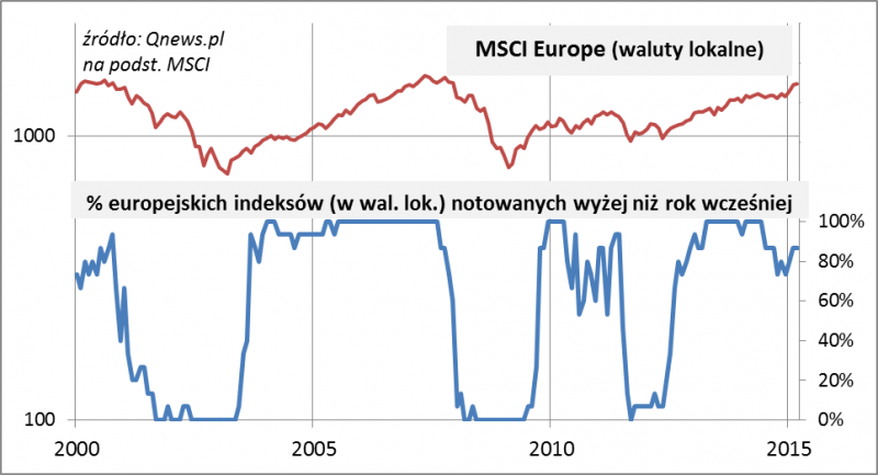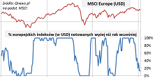 Jeśli weźmiemy te same indeksy, ale wyrażone w walutach lokalnych (głównie w euro, ale nie tylko), to okaże się, że statystyki wyglądają zupełnie inaczej. Zbiorczy MSCI Europe zgodnie z intuicją bije rekordy hossy, a 87 proc. europejskich indeksów krajowych notowanych jest wyżej niż rok wcześniej.