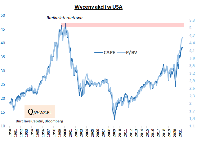 Ale czy to oznacza, że w USA jest już tak ekstremalnie drogo, że drożej być nie może? Chyba niekoniecznie, bo omawiane wskaźniki ciągle nie dotarły jeszcze do strefy historycznych szczytów z czasów tzw. bańki internetowej (47,1 w przypadku CAPE i 5,03 w przypadku P/BV).