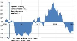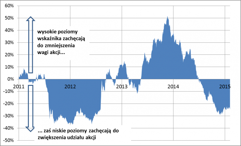 Co do konkretów, można zaproponować następujące „wytyczne”: kiedy wskaźnik spada poniżej -10 pkt. proc., waga akcji jest zwiększana z domyślnego pułapu 50 proc. do 60 proc. Spadek wskaźnika o każde kolejne 10 pkt. proc. zachęca do zwiększenia wagi również o kolejne 10 pkt. proc. (łatwo wyliczyć, że po spadku wskaźnika do -50 pkt. proc. portfel zostaje w całości wypełniony akcjami). Oczywiście można sobie wyobrazić inny schemat – ten przedstawiony tu ma charakter poglądowy.
