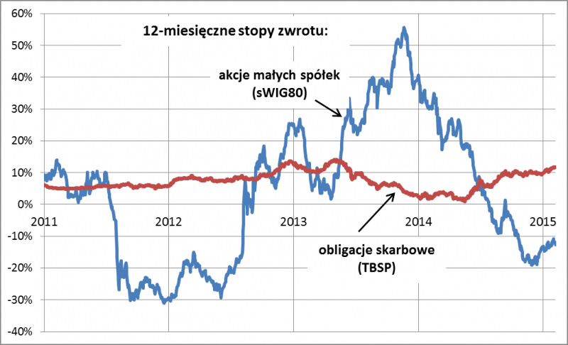 Zauważyć tu można kilka ciekawych kwestii. Pierwsza jest dość oczywista – stopy zwrotu z akcji małych spółek podlegają dużo silniejszym wahaniom, zarówno in plus, jak i in minus. Mniej oczywiste jest być może to, że wyraźnym wahaniom (na skutek zmian stóp procentowych) podlegają także stopy zwrotu z koszyka obligacji. Zauważmy, że choć obecnie 12-miesięczne zyski wynoszą kilkanaście procent, to nie tak dawno roczne zyski były bliskie zera. Nietrudno wyobrazić sobie też sytuację, w której stopy zwrotu będą poniżej zera (na skutek ewentualnego spadku cen obligacji). Przed trzema tygodniami pokazaliśmy dokładnie jaka jest wrażliwość cen obligacji na różne scenariusze rynkowe.