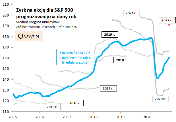 W amerykańskich opracowaniach często agreguje się prognozy na poszczególne lata, obliczając EPS ważony upływającym czasem. Przykładowo obecnie taki forward 12-month EPS składa się w coraz mniejszym stopniu z prognozy na ten rok, a w coraz większym z projekcji na 2021. Ponieważ przyszłoroczny szacunek jest dużo wyższy niż tegoroczny, to automatycznie forward EPS wraz z upływem czasu idzie wyraźnie w górę. Niebieska linia w coraz większym stopniu przesuwa się w kierunku EPS'21.