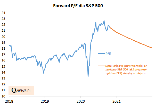 Na powyższym wykresie pokazujemy jednocześnie, że nawet jeśli prognozy zysków na 2020-22 będą stały w miejscu, to za sprawą omówionego efektu upływającego czasu forward P/E będzie się stopniowo normalizował.