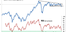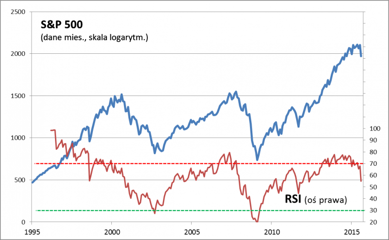 Jeśli założyć, że trend spadkowy na EM oznacza, że inwestorzy dyskontują spowolnienie gospodarcze w tej grupie krajów (z Chinami na czele), to pośredniego wpływu tego spowolnienia zaczęto obawiać się także na rynkach rozwiniętych. Amerykański S&P 500 po półrocznej stagnacji zaczął mocno się korygować. Tutaj niestesty do pojawienia się oznak tak mocnego wyprzedania jak na rynkach wschodzących jeszcze daleka droga, choć nie ma przecież żadnej gwarancji, że wskaźniki i tutaj muszą zejść tak nisko. Zauważmy, że w dołku mocnej korekty na jesieni 2011 r. RSI zszedł w okolicę 40 pkt., po czym koniunktura zaczęła się poprawiać.