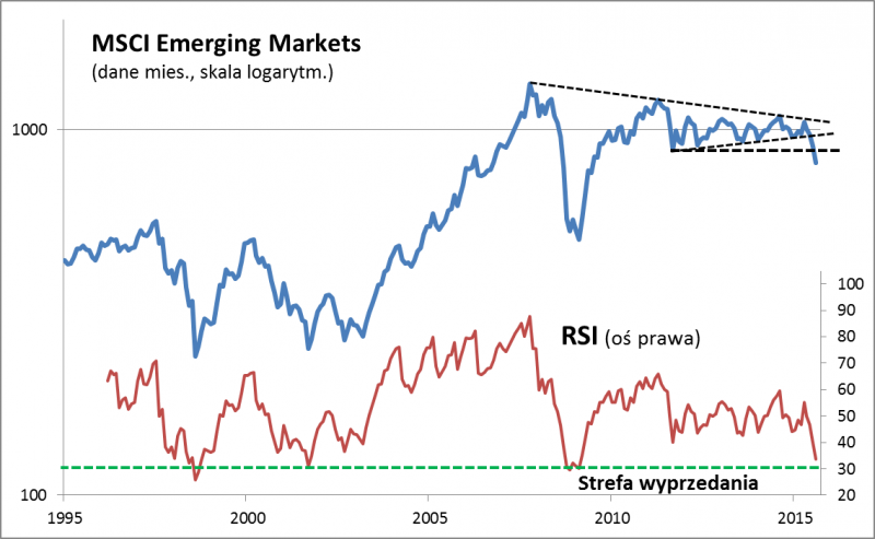 Widoczny na wykresie popularny wskaźnik RSI (wg danych miesięcznych) to dobry barometr schłodzenia koniunktury. Dobra wiadomość jest taka, że RSI jest już relatywnie nisko - najniżej od przełomu lat 2008/2009. Dojście do poziomów, przy których historycznie nadarzały się świetne okazje do kupowania EM, to kwestia raczej bliskiej niż dalszej przyszłości.