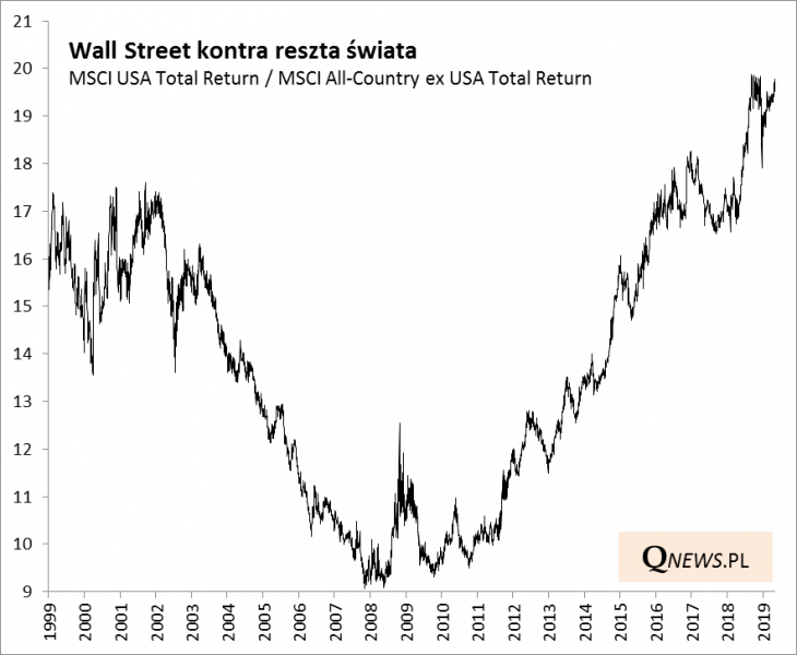 Relatywną odporność Wall Street można tłumaczyć rozmaitymi bieżącymi czynnikami (względna siła gospodarki USA), ale warto też przypomnieć długoterminowy kontekst, na który już wielokrotnie w ostatnich latach zwracaliśmy uwagę. Amerykańskie akcje pozostają liderem obecnej, liczącej sobie ponad 10 lat hossy. Współczynnik siły relatywnej akcji z Wall Street względem reszty świata jest znów w okolicach szczytów.
