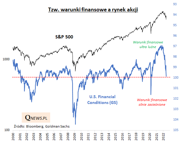 Jeśli spojrzymy na jeden z najpopularniejszych wskaźników financial conditions, autorstwa banku Goldman Sachs, jasne staje się, że faktycznie uległy one już mocnemu zacieśnieniu względem stanu z ubiegłego roku, kiedy to osiągnęły ekstremalnie luźne poziomy.