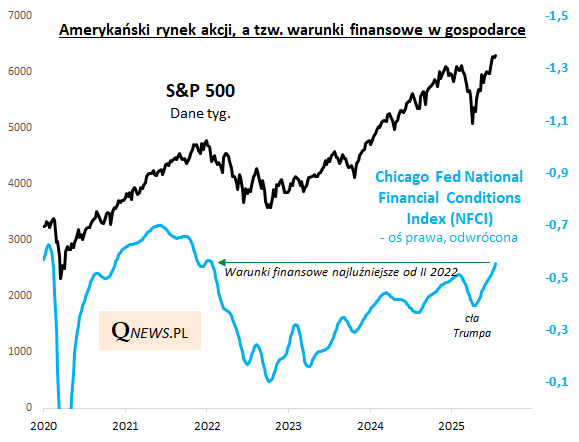 W tym kontekście w oczy rzuca się fakt, że jeden z najważniejszych wskaźników warunków finansowych, liczony przez oddział Fedu w Chicago indeks NFCI, osiągnął w ostatnich tygodniach poziomy najluźniejsze od lutego 2022 roku (a więc sprzed ataku Rosji na Ukrainę i sprzed kulminacyjnej fazy szoku inflacyjnego). Oznacza to zarazem, że warunki finansowe są luźniejsze niż tuż przed zawirowaniami wywołanymi przez cła Trumpa (Liberation Day).