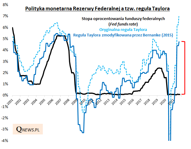 Wysoka inflacja w połączeniu z silną poprawą koniunktury od czasu pandemicznego wstrząsu (tzw. luka PKB została w dużym stopniu domknięta) sprawiają, że reguła Taylora implikuje gwałtowny wzrost stóp procentowych. Wg pierwotnej wersji reguły, stopa oprocentowania funduszy federalnych powinna obecnie wynosić ... prawie 7% (!!!), podczas gdy w rzeczywistości jest niemal zerowa. Stopa Fedu jest drastycznie zaniżona nawet wg mocno złagodzonej wersji tej reguły, zaproponowanej kilka lat temu przez byłego szefa Rezerwy, B. Bernanke. To właśnie ta modyfikacja miała usprawiedliwić długotrwałe utrzymywanie niemal zerowych stóp po globalnym kryzysie finansowym 2008/09. Teraz jednak nawet ona sugeruje, że stopy powinny sięgać 4,7% (!).