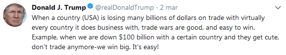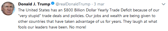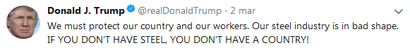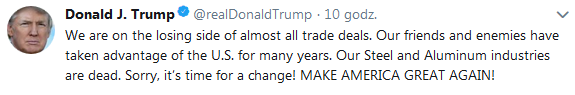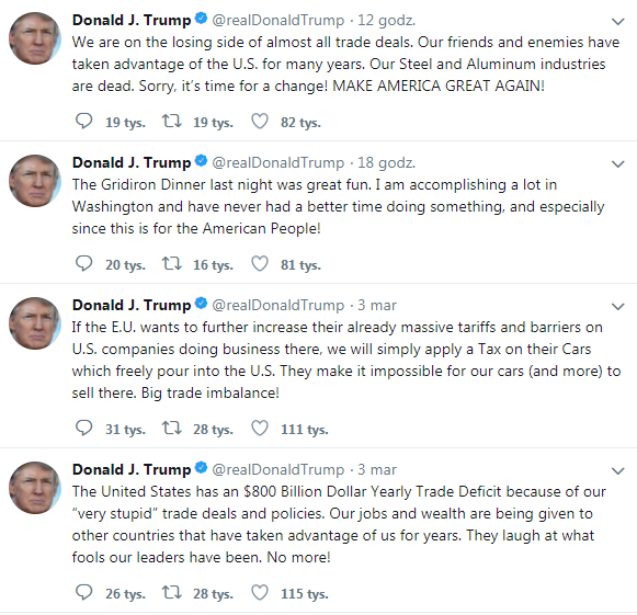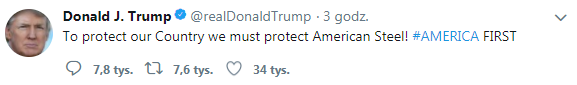 Ale i tak najważniejszą kwestią są poczynania prezydenta Trumpa, który zaczyna pokazywać swoje drugie oblicze, którego tak obawiano się przed wyborami na jesieni 2016. Amerykański polityk coraz odważniej forsuje kolejne pomysły podwyżek ceł. Retoryka protekcjonistyczna staje się coraz bardziej agresywna. "Musimy chronić nasz kraj i naszych pracowników", "jeśli nie masz stali, nie masz kraju!", "wojny handlowe są dobre i łatwe do wygrania" - to tylko niektóre z serii haseł, jakimi Trump epatuje na Twitterze w ostatnich dniach.