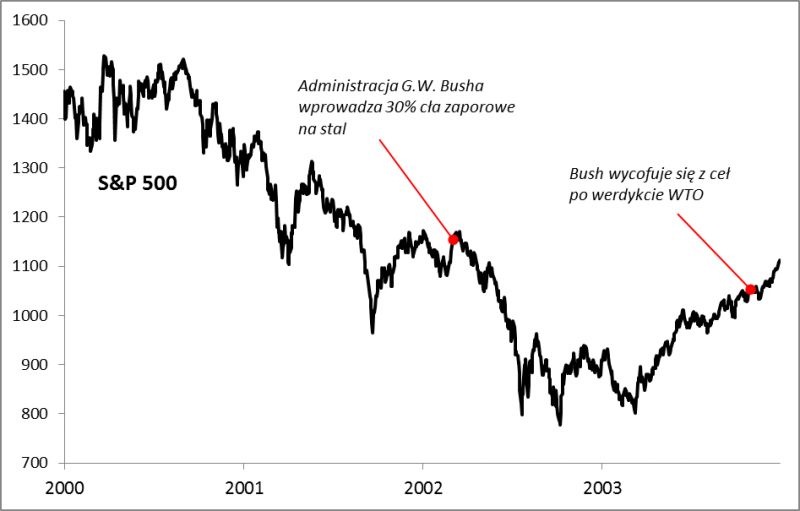 Argumenty ekonomistów i zapowiedzi kontrreakcji krajów dotkniętych pomysłami protekcjonistycznymi zdają się nie robić wielkiego wrażenia na prezydencie USA. A jaki wpływ potencjalna globalna wojna handlowa miałaby na rynki? Wystarczy sięgnąć do historii. Stosunkowo "młodym" przykładem są cła zaporowe - co ciekawe również na stal - nałożone w trakcie recesji w marcu 2002 r. przez prezydenta G. W. Busha. "Ochrona krajowego przemysłu" wtedy zdecydowanie nie pomogła rynkowi akcji, który potem zaliczył jeszcze ostatnią, najmocniejszą falę bessy (oczywiście obecna sytuacja jest odmienna - rynki akcji są blisko szczytów, a nie po kilku falach spadkowych).