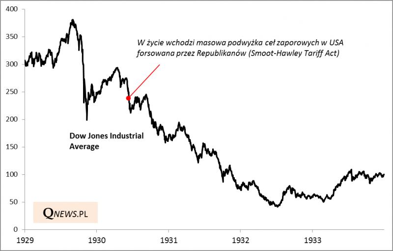 Sięgnijmy jeszcze dalej do historii. Jednym z najsłynniejszych, książkowych przykładów niebezpiecznej polityki protekcjonizmu była ustawa Smoota-Hawley'a z czerwca 1930 r., która nałożyla cła zaporowe na ponad 20 tys. importowanych towarów (na szczęście obecne pomysły prezydenta USA to póki co "drobnostka" w porównaniu z tamtą polityką). W ciągu kolejnych dwóch lat patrnerzy handlowi USA zareagowali podwyżkami ceł, co w efekcie przyczyniło się do załamania światowego handlu i wejścia gospodarek w kolejną fazę Wielkiego Kryzysu lat 30.