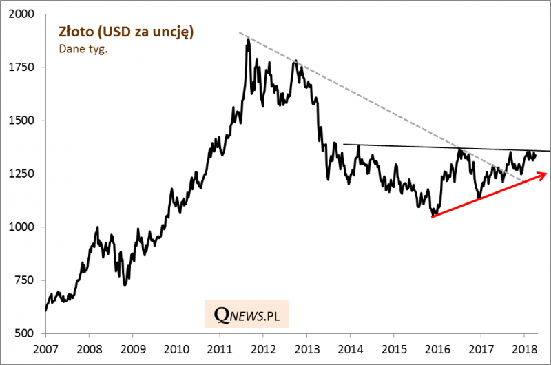 Od początku roku notowania metalu konsolidują się tuż poniżej linii oporu łączącej lokalne szczyty począwszy od 2014 roku. To swoista granica trendu bocznego, w jakim cena tkwi od czterech lat. Jej przebicie byłoby pozytywnym sygnałem z punktu widzenia analizy technicznej.