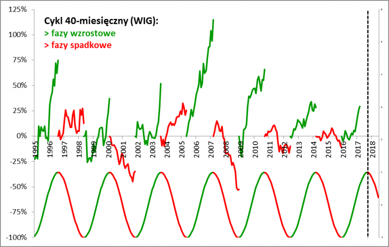 Przy okazji warto przypomnieć (kontrowersyjną) analogię, o której pisaliśmy w lutym, według której obecne wydarzenia bardzo przypominają okres wychodzenia rynków wschodzących z załamania związanego z kryzysem rosyjskim w 1998 r. Przypomnijmy, że wg prostego porównania z tamtą sytuacją indeks emerging markets "powinien" bez większych przystanków rosnąć gdzieś do lata. W tym samym terminie wypada też teoretyczny szczyt opisywanego przez nas wielokrotnie cyklu 40-miesięcznego na GPW. Co ciekawe mimo że tegoroczna fala zwyżkowa wydaje się tak zaskakująco silna, to póki co nie wygląda ona zbyt imponująco w porównaniu z historycznymi fazami wzrostowymi tego cyklu.