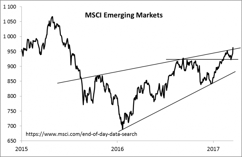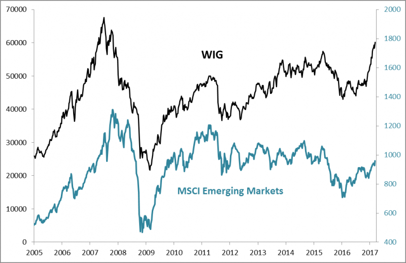 Gdzie szukać źródeł dobrej koniunktury? W dużym stopniu w rozwoju wydarzeń na rynkach wschodzących (Polska to ciągle jeden z nich), których indeks jest od ponad roku w trendzie wzrostowym. Warto przypomnieć z jak niskiego punktu wystartował ten trend - jeszcze na początku 2016 indeks emerging markets był najniżej od sześciu (!) lat.