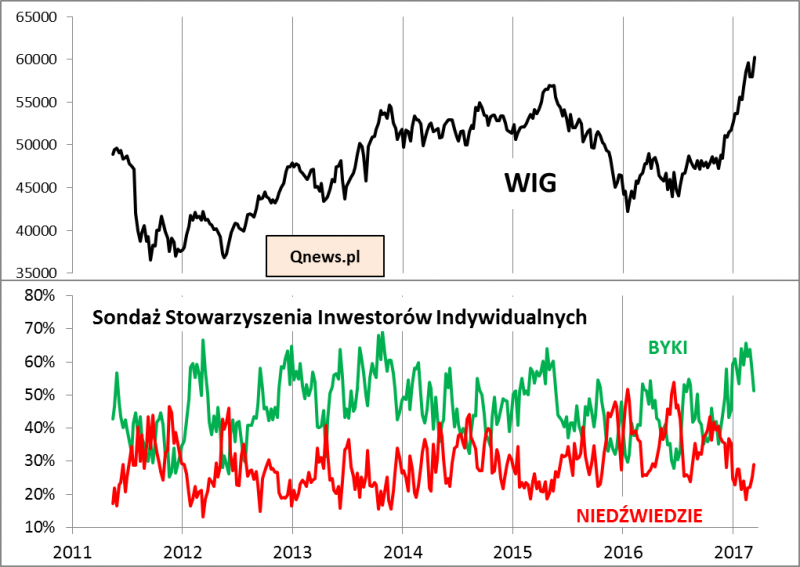Wg wczorajszego sondażu SII odsetek byków (optymistów) wśród inwestorów ... zmalał do poziomu najniższego od 11. tygodni (do 51%). Przyznajemy, że mamy problem z interpretacją takiego wyniku. Skoro WIG wspina się na nowe szczyty przy szybko malejącym optymizmie, to czy nie jest to przypadkiem sygnał, że ... zwyżka może jeszcze potrwać? Warto przy okazji zwrócić uwagę, że wszystkie te zaskakujące wydarzenia rozgrywają się tuż przed piątkowym wygaśnięciem marcowej serii kontraktów terminowych na WIG20.