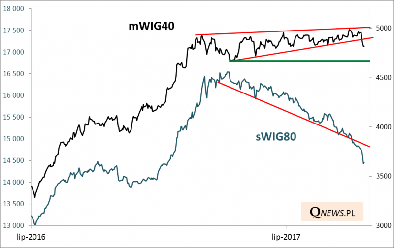 Reasumując, hossa na GPW stała się wyjątkowo wybiórcza. O ile jeszcze zdominowany przez duże spółki WIG utrzymuje się powyżej linii wsparcia (będziemy ją bacznie obserwować), to pozostałe segmenty rynku wyraźnie ostatnio osłabły.