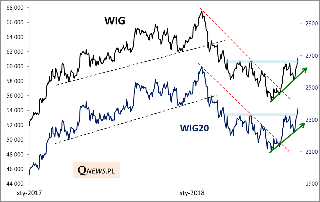 Wraz ze wspinaczką WIG-u na poziom najwyższy od marca sytuacja techniczna na wykresie głównego indeksu GPW ulega stopniowej ewolucji - od trendu spadkowego do ... wzrostowego.