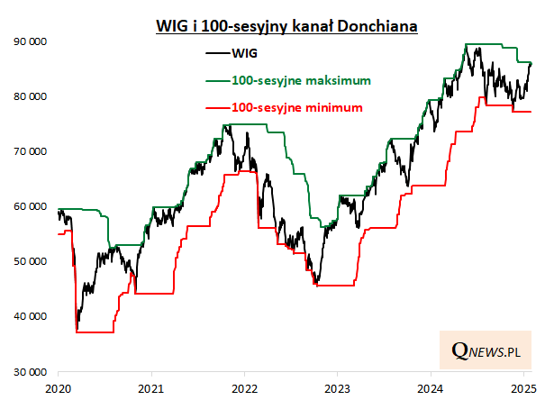 Reasumując, bardzo bliskie już dojście WIG do 100-sesyjnego maksimum to zgodnie z koncepcją tzw. kanału Donchiana pozytywna wiadomość, choć oczywiście strategia ta nie jest pozbawiona wad.