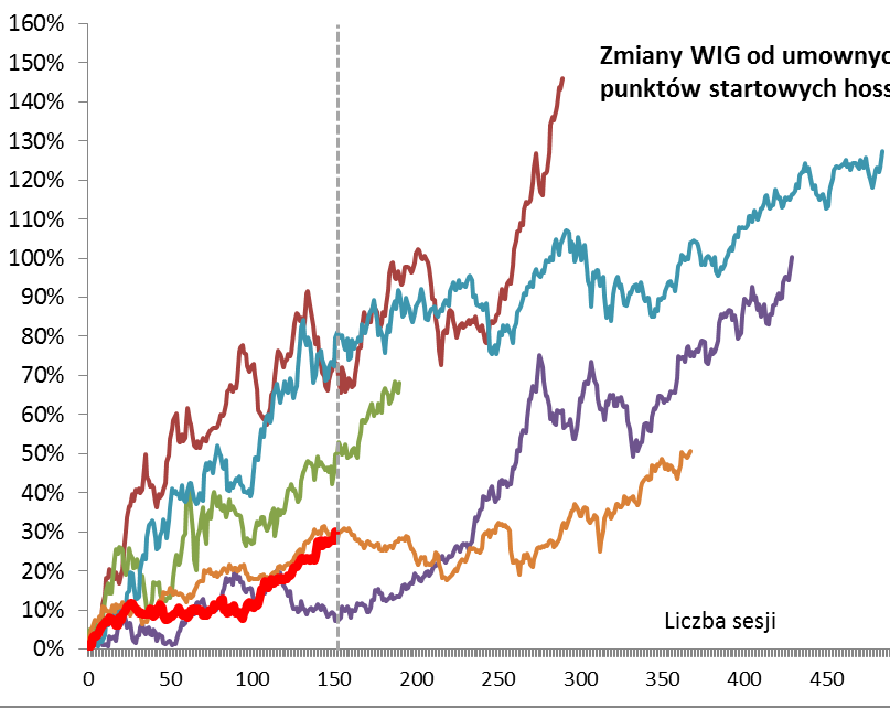 Sprawdźmy jak fala zwyżkowa trwająca umownie od lipca 2016 r. (nieco niżej położony był dołek ze stycznia 2016, ale I półrocze ub.r. trudno byłoby nazwać hossą) wygląda na tle historycznych rynków byka.