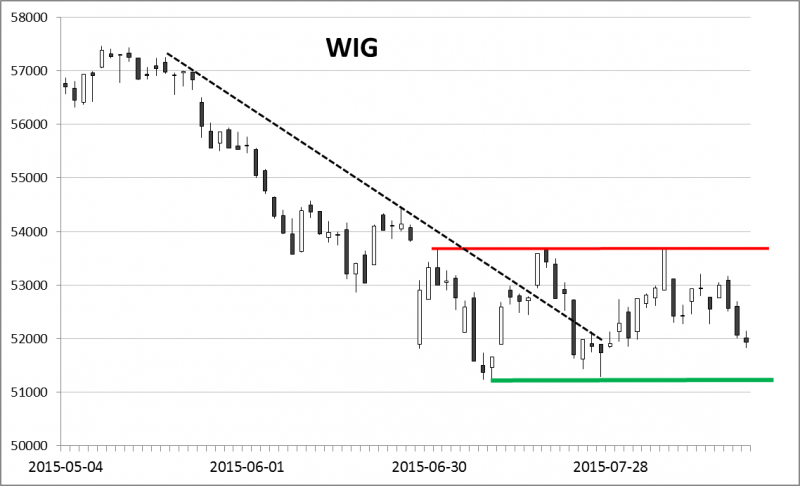 Najpierw paniczna wyprzedaż akcji banków po przegłosowaniu przez Sejm ustawy dot. przewalutowania kredytów frankowych zatrzymała marsz indeksu dokładnie na poziomie oporu (ok. 53.700 pkt.). Potem słabość rynków wschodzących i nerwowe reakcje świata na dewaluację chińskiej waluty, pociągnęły WIG w kierunku kluczowego poziomu wsparcia (ok. 51.200 pkt.). Dopóki indeks pozostaje pomiędzy tymi dwoma granicami, panuje trend boczny. Przebicie któregoś z nich sygnalizowałoby wejście odpowiednio w trend wzrostowy (w przypadku przebicia oporu) albo spadkowy (w przypadku przebicia wsparcia).