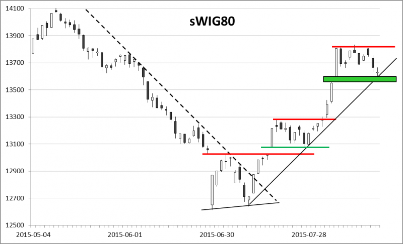 Oczywiście nawet i tutaj w obliczu rażącej słabości indeksów dużych spółek nie mogło się obyć ostatnio bez zadyszki. Od ok. dwóch tygodni sWIG przeżywa korektę wcześniejszych dynamicznych zwyżek. Dopóki jednak indeks "maluchów" utrzyma się powyżej zaznaczonej na zielono strefy wsparcia zwanej w żargonie analityków technicznych "luką hossy" (ok. 13.550-13.600 pkt.), struktura trendu wzrostowego pozostanie zachowana. Innymi słowy, będą realne szanse na zakończenie korekty i powrót do wzrostów. Oczywiście to się prawdopodobnie nie uda, jeśli i WIG nie podniesie się po ostatnich słabszych tygodniach.