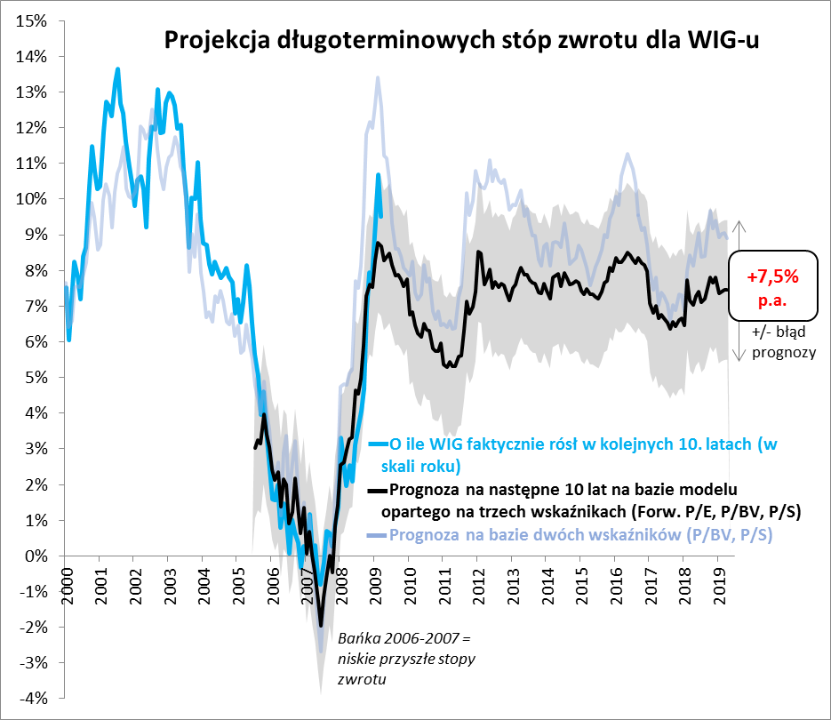 - Czy model nie przestanie kompletnie działać (akurat o to jesteśmy w miarę spokojni – intuicyjna zasada „im tańsze akcje, tym lepsze stopy zwrotu na długą metę” działa na wielu rynkach; poza tym nasza projekcja uwzględnia możliwy błąd prognozy);