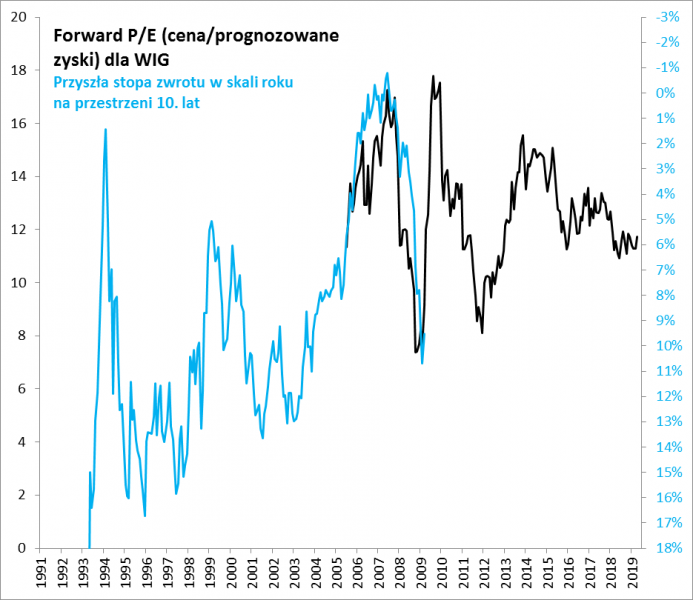 Rys. 1. Najbardziej popularny wskaźnik P/E daje najmniej optymistyczną prognozę, ale jego wadą jest dość krótka historia