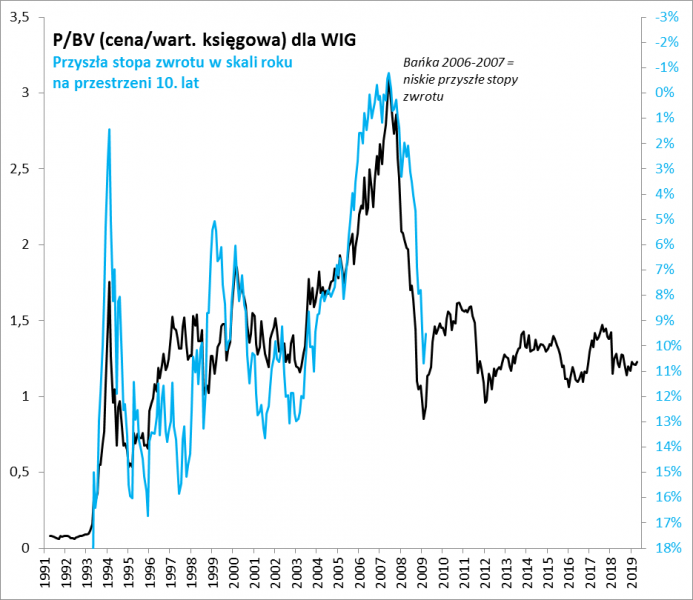 Rys. 2. Wskaźnik P/BV daje dla odmiany najbardziej optymistyczną prognozę, bo jest nisko względem swej historycznej średniej
