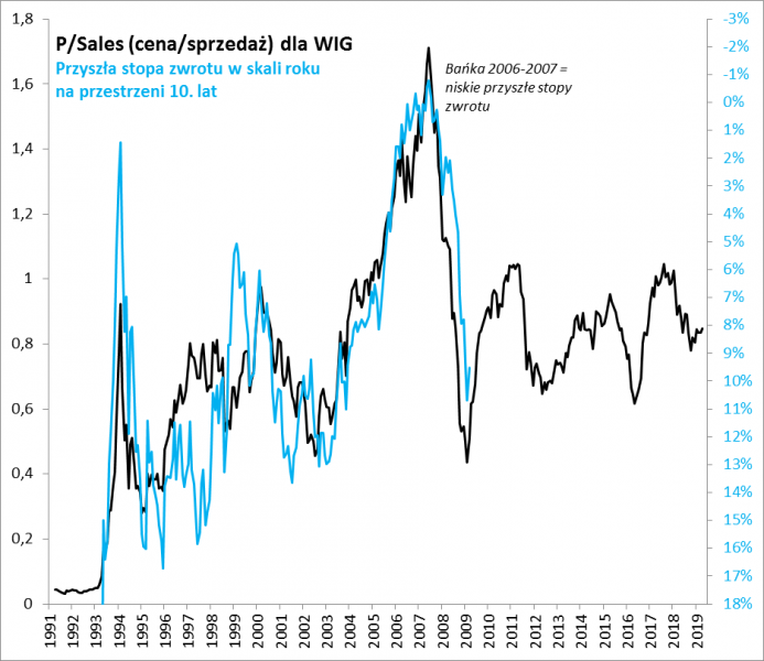 Rys. 4. Model trafnie prognozowałby kiepskie stopy zwrotu z akcji kupowanych w czasie euforii lat 2006-2007 i świetne stopy zwrotu na początku 2009 roku; teraz prognoza jest na niezłym pułapie