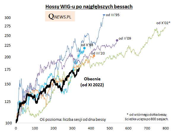 Czy zwyżka o 77 proc. w ciągu ponad 16 miesięcy (prawie 340 sesji) oznacza, że hossa jest już na wysokim stopniu zaawansowania? Aby to ocenić, porównajmy wspinaczkę trwającą od jesieni 2022 z poprzednimi hossami, które miały miejsce po najgłębszych bessach w historii. Tak zdefiniowanych cyklicznych fal wzrostowych było do tej pory pięć. Startowały z dołków odnotowanych odpowiednio w marcu 2020, lutym 2009, październiku 2001 (z wtórnym dołkiem w lipcu 2002), październiku 1998 i marcu 1995.